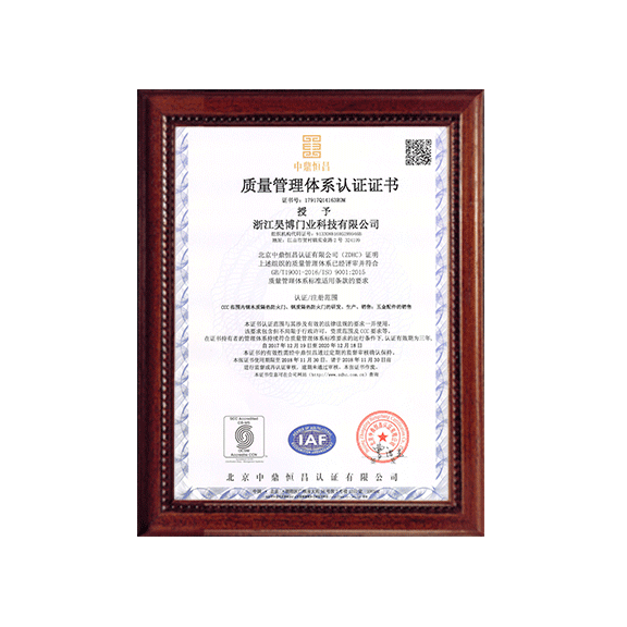 公司一直以來嚴格執(zhí)行ISO9001質(zhì)量體系和ISO14001環(huán)境管理體系標準,建立了完備的科研、開發(fā)、生產(chǎn)、銷售服務體系。公司是浙江省門業(yè)協(xié)會會員單位,江山門業(yè)協(xié)會理事單位,中國木材與木制品流通協(xié)會會員單位,江山市消防協(xié)會副會長單位。